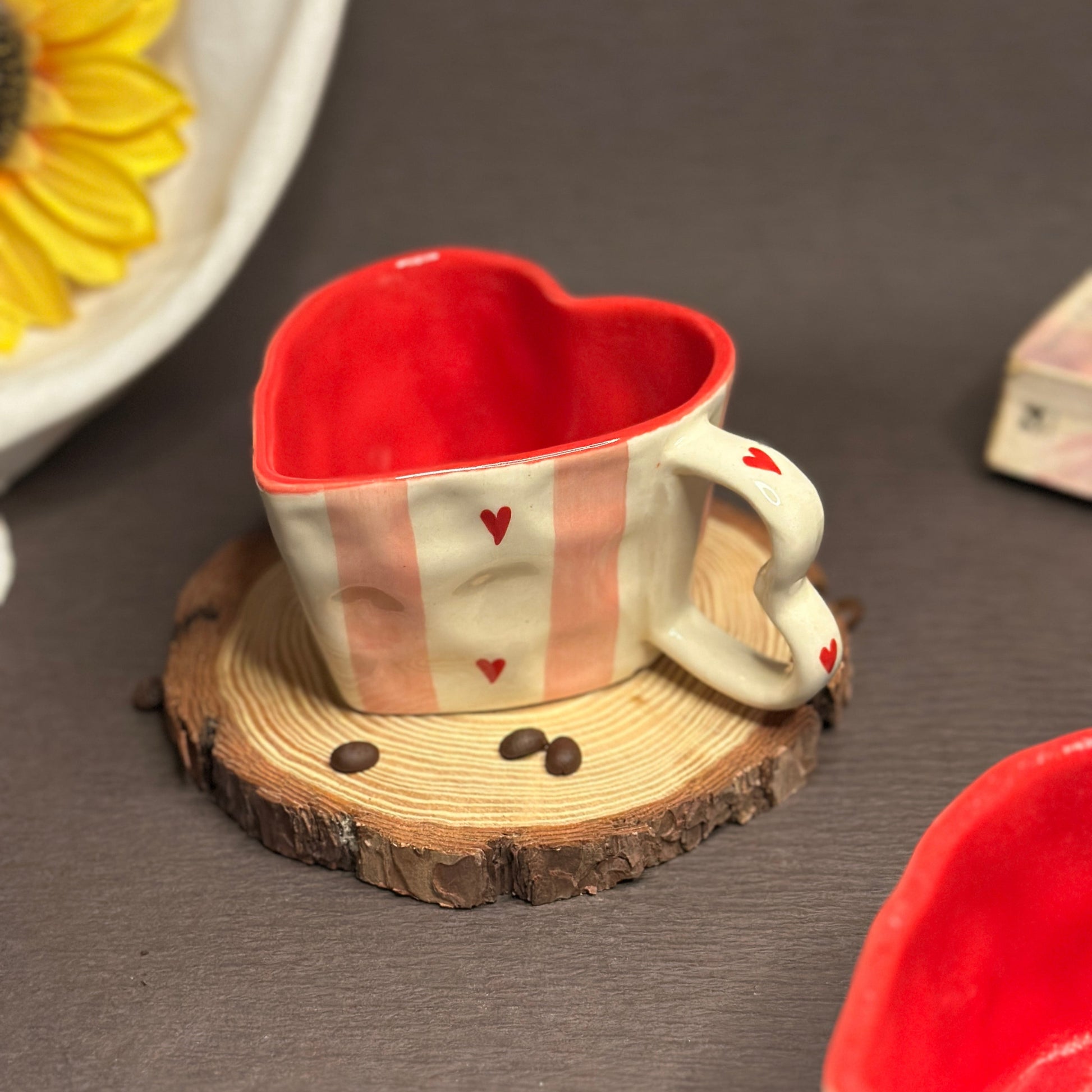 Crafted in ceramic with a glossy red glaze inside, the Striped Hearts Mug brings a touch of charm to your collection. Its hand-painted blush stripes and tiny heart details make it both playful and modern, balancing sweetness with simplicity.